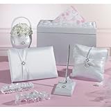 This elegant diamond wedding set features smooth white satin and accented by a white bow and diamond decoration. The set includes guest book, pen set, flower girl basket, ring pillow and garters. The set comes in a elegant white13.5" x 7" x 8.5" card box, which can be used as reception gift card box. Guest Book 10" wide and has space for over 600 guest signatures. Pen Set 5" pen base. Comes with silver pen. Black ink. Flower Girl Basket - stands 7" tall Ring Pillow - Each corner has a lovely tassel. The front of the 8" square pillow is decorated with a diamond ornament. Garters: One keepsake, one for tossing. Read more