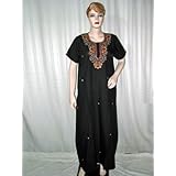 Gift for Mother - Black Indian Fine Cotton Embroidered Caftan Short Sleeve Night Lounge Wear L Free Shipping (Apparel)