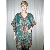 Resort Wear Designer V Neck Floral Print Satin Crepe Blue Short Caftan Tunic Top Poncho Free Shipping (Apparel)