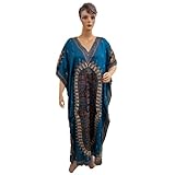 Resort Wear Womens Ethnic Print Satin Crepe Caftan Kaftan Royal Blue Evening Dress (Apparel)